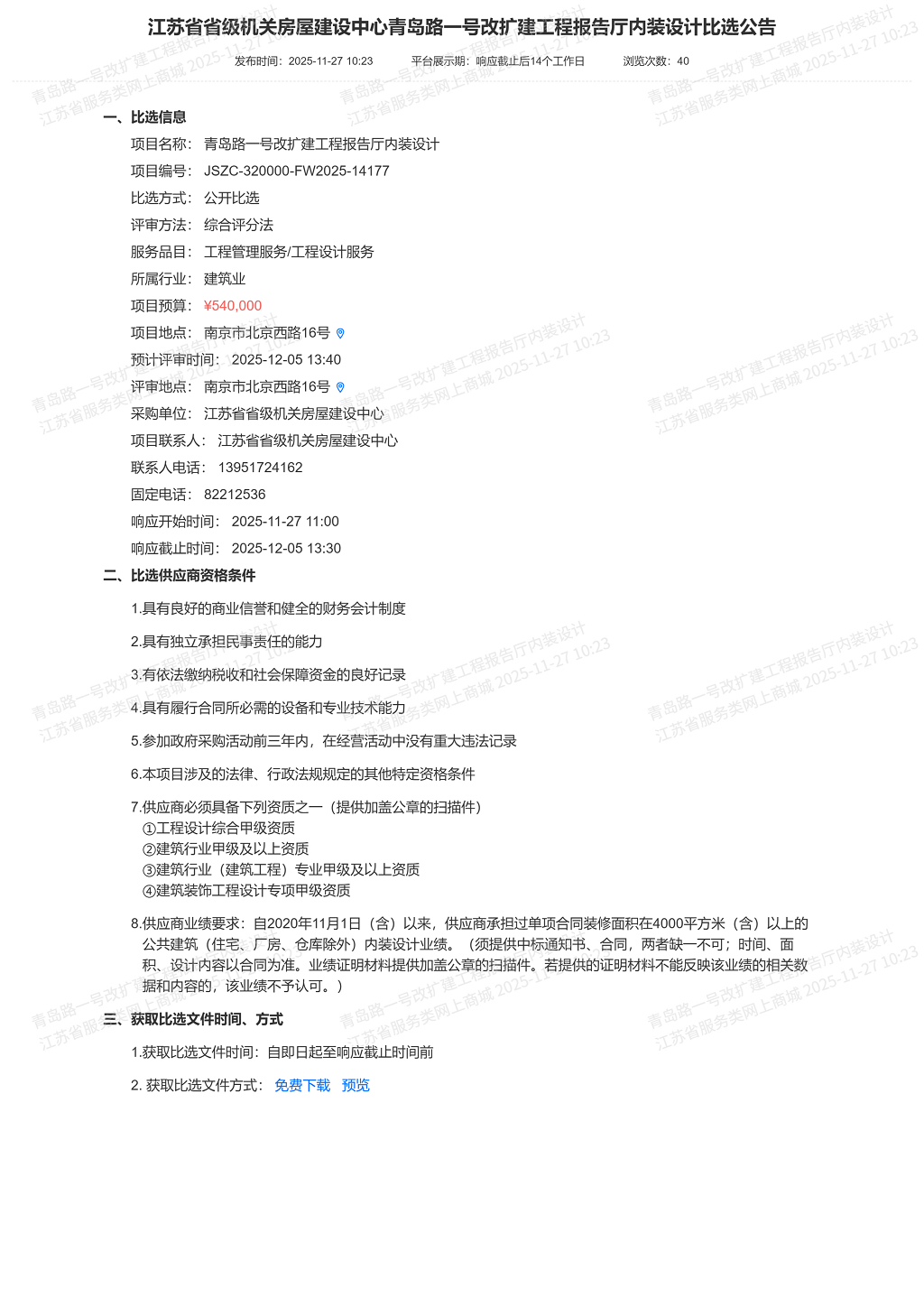 青岛路一号改扩建工程报告厅内装设计比选公告