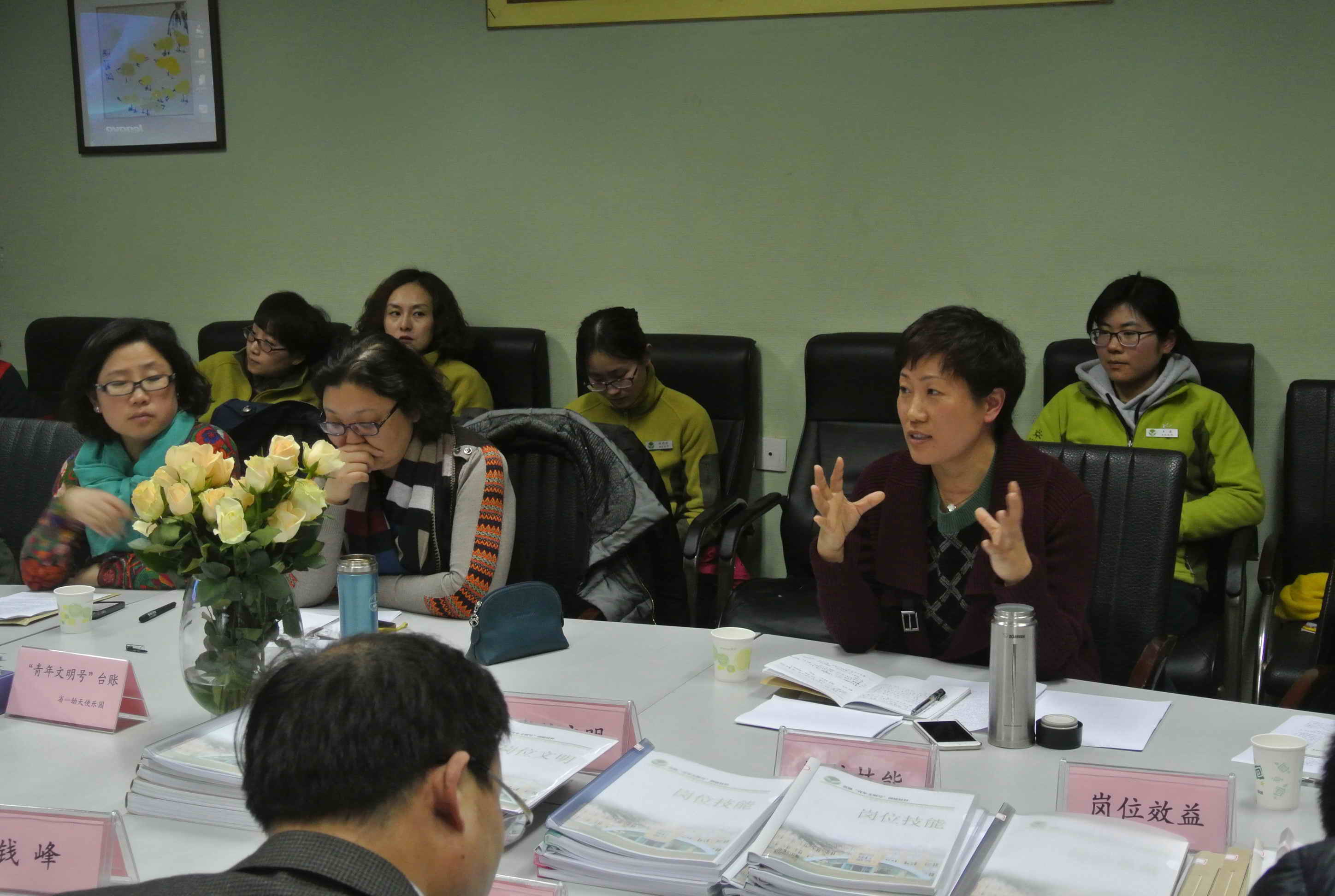 国标部部长谢静波代表国标部青年教师组向检查小组的领导汇报了该组2013——2014年度的创建情况。自开展创建活动以来,坚持党建带团建,成立了省级“青年文明号”创建小组,制定实施了《国标部青年教师组“青年文明号”工作制度》,明确了以“青年文明号”活动为载体,定期组织各种形式的学习和各种形式的创建活动。在本职岗位上恪守职业道德,遵守职业规范,努力做到无举报、无投诉现象。在校园文化活动中,在岗位练兵活动中,在社会公益活动中培养了爱岗敬业、文明服务、开拓进取、无私奉献、创一流服务及一流业绩的青年教师队伍。接着姚建香书记对创建工作进行了点评,她指出国标部青年教师部在创建过程中,始终将青春与文明、创建与成长、学习与实践等贯穿其中,结合本职工作,通过扎实有效的创建活动载体,为青年教师的成长搭建了良好的平台。